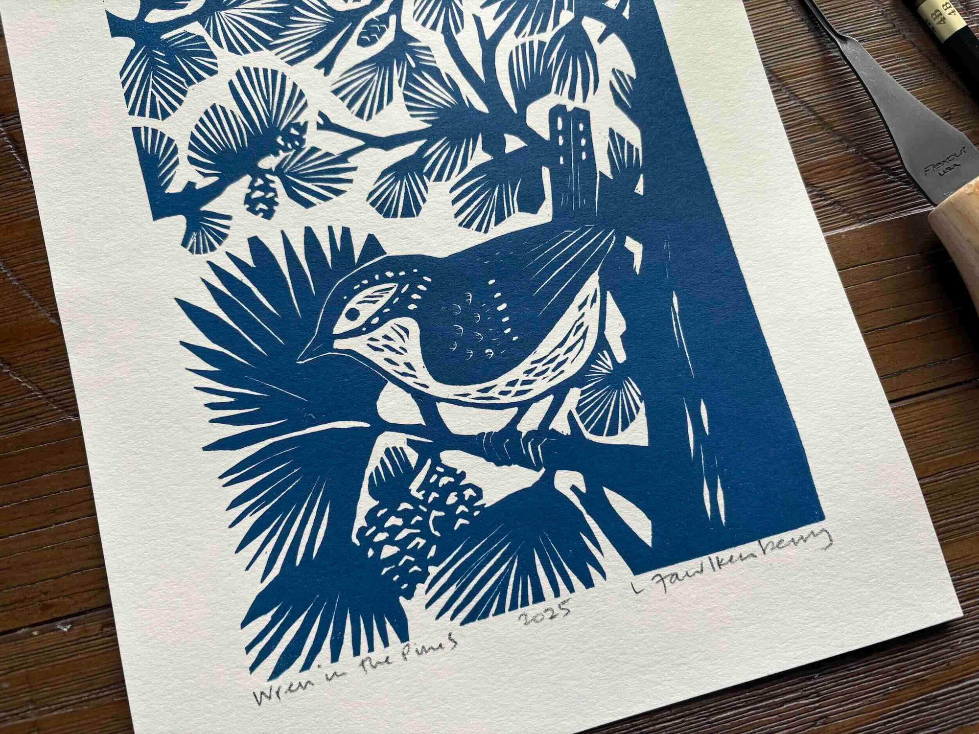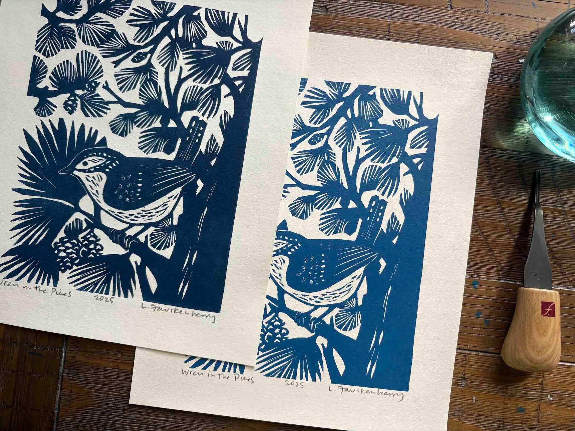 This original linocut print, "Wren in the Pines," was printed by hand using a linocut block. This process begins with a drawing that I transfer onto the lino block and then carve by hand with small hand tools. I then ink the block by hand and and use firm pressure with hand tools to transfer the image onto the paper. This print is made by using soft, 100% cotton printmaking paper that is acid-free and archival. Linocut printing is a lovely process that allows the paper to pick up some of the stray marks (or "chatter") left intentionally on the block. Each print is lovingly pulled by hand in my home studio, then signed and dated by me.