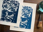 Printed in blue ink on Legion cotton printmaking paper, soft white in color. I currently have two shades of blue in stock--choose from a deep navy or softer cyan.