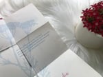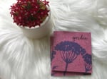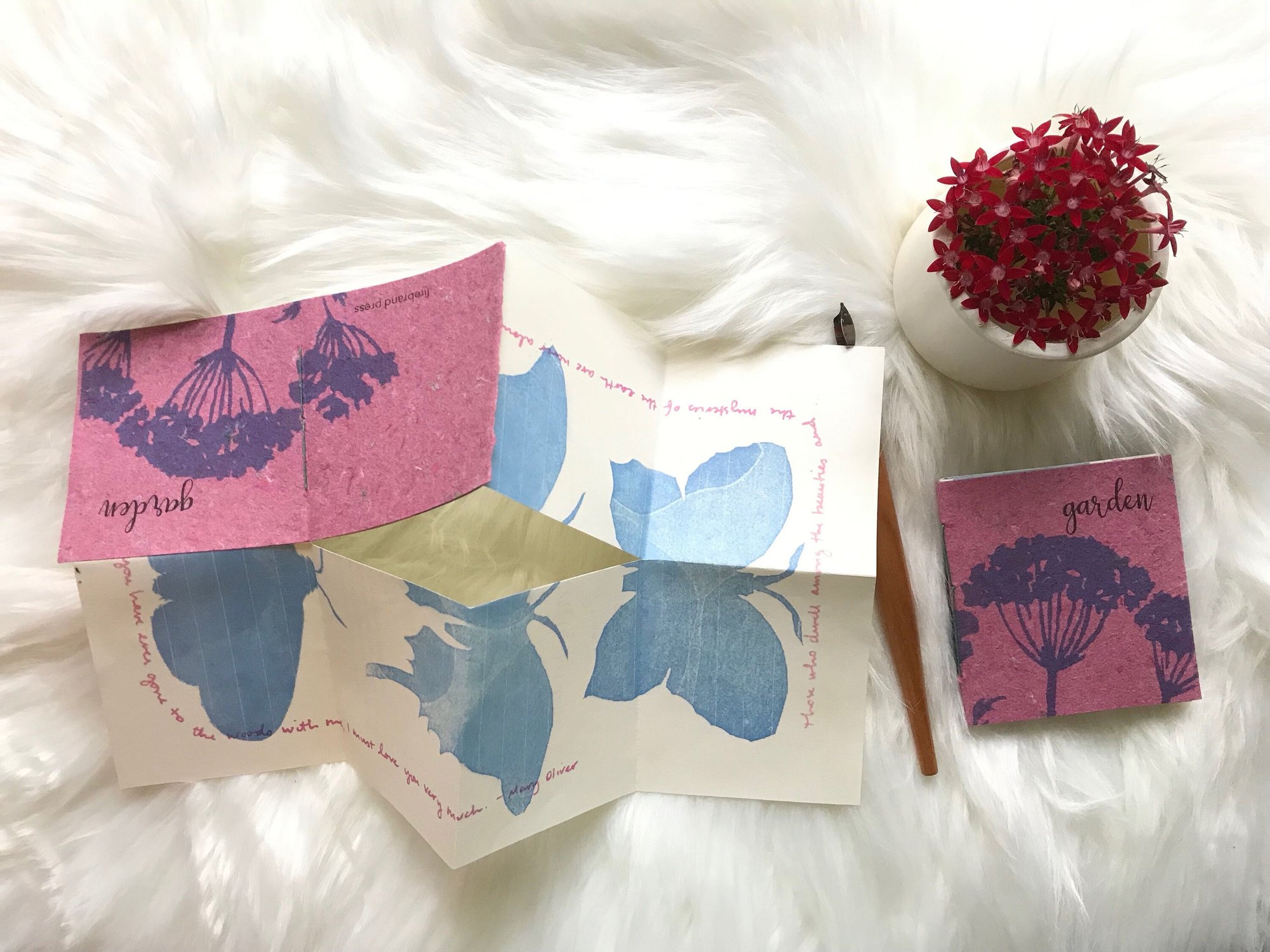 Each book is sewn together by hand with a pamphlet stitch using linen bookbinding thread. The cover is made from handmade paper. The inside sheet is printed on archival soft white paper from the French Paper Company in Niles, Michigan. Books open out to 6" by 12" and fold down to a neat 3" square. Available with your choice of cover paper, denim blue or bright pink.