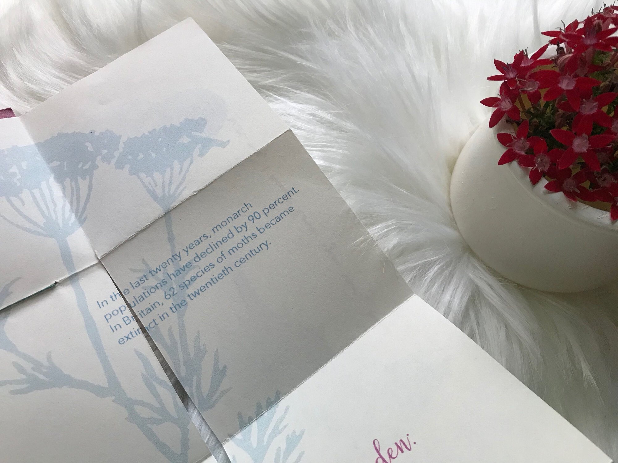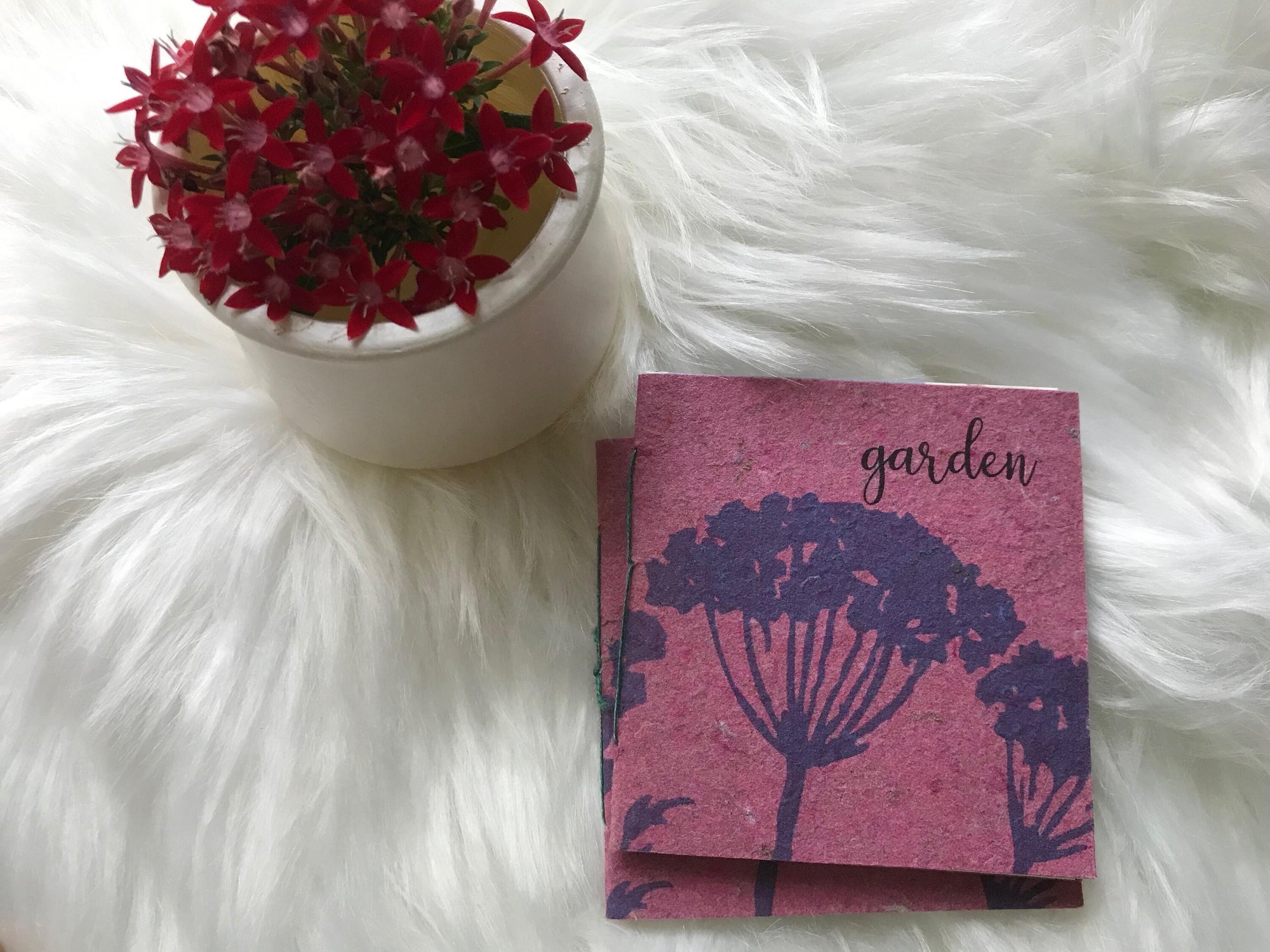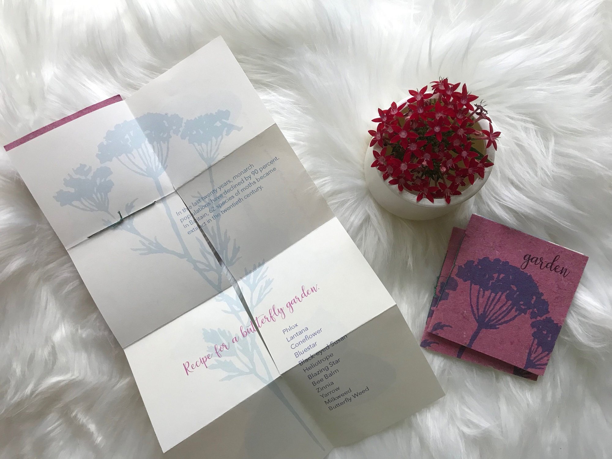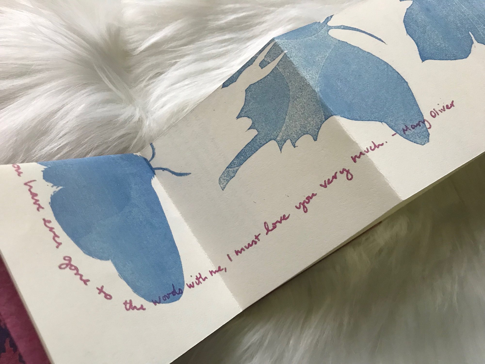 This miniature book tells you how to build your own butterfly garden. Made in the "secret room" structure, this is a single printed sheet that folds down into a tiny book with a handmade paper cover. This book has images and text printed on both sides of the page and a "secret room" with additional text that appears when you open it a certain way. Images are digital prints of a linoleum block print of butterflies and a moth, with a couple of my favorite nature quotations. The reverse side features a botanical illustration with a recipe to build your own backyard butterfly garden with easy-to-find plants.