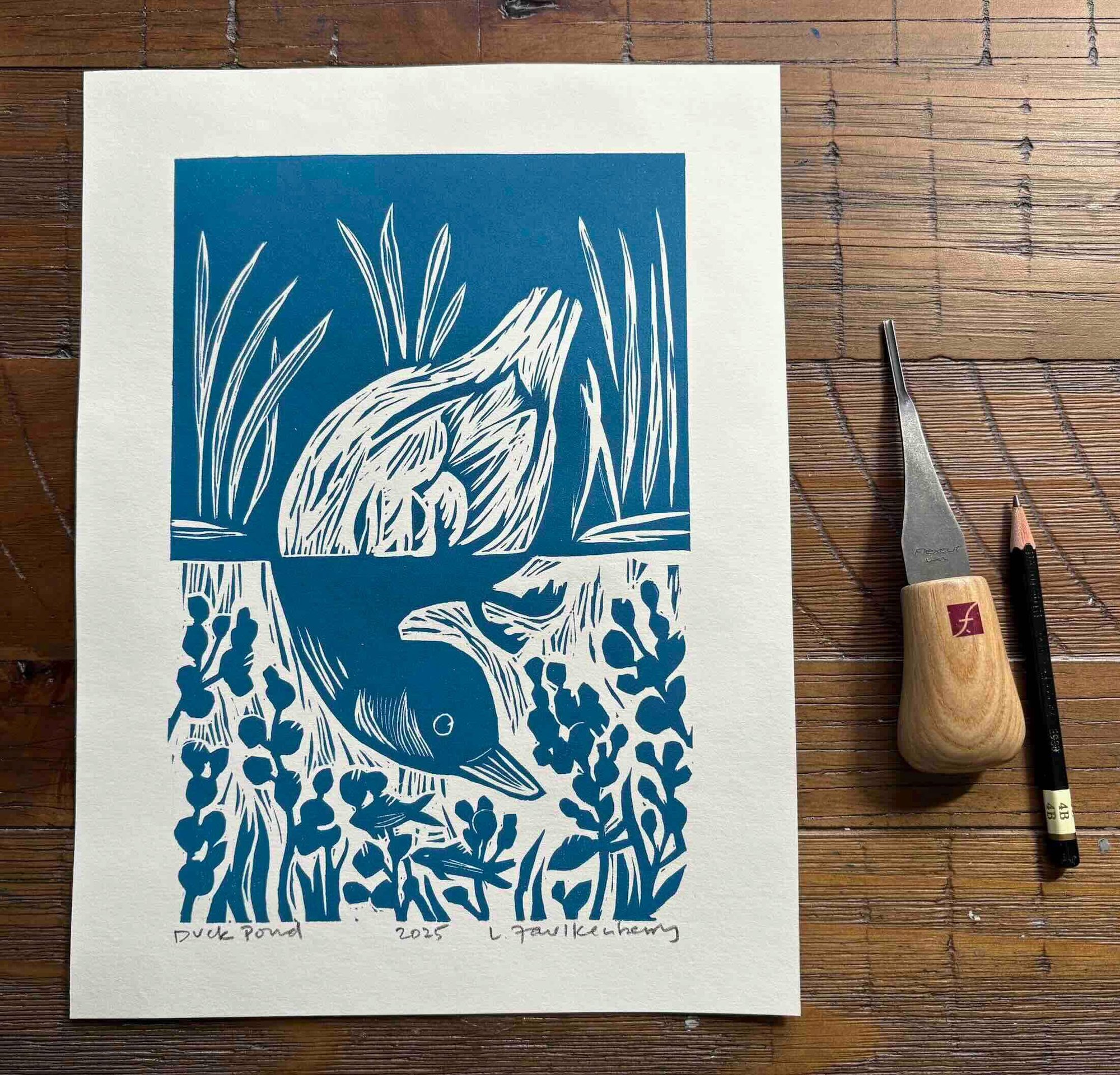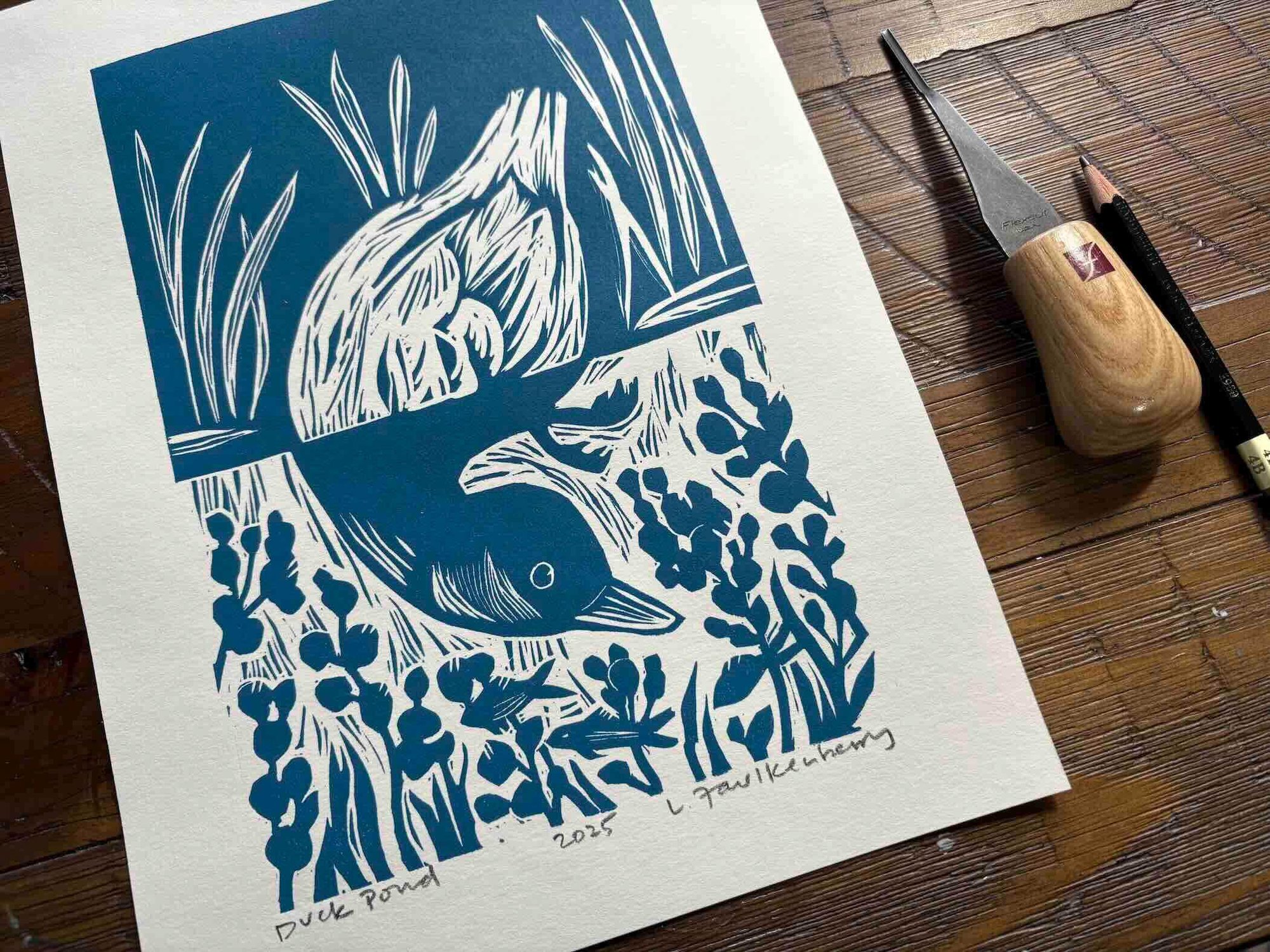 This original lino print, "Duck Pond," was printed by hand using a linocut block. This process begins by hand-carving a linoleum block with an image, then inking the block and using special hand tools to print the image onto the paper. This block is printed on soft, heavyweight 100% cotton Stonehenge printmaking paper that is acid-free and archival. Linocut printing is a lovely process that allows the paper to pick up some of the stray marks (or "chatter") left intentionally on the block when carving. Each print is signed and dated.