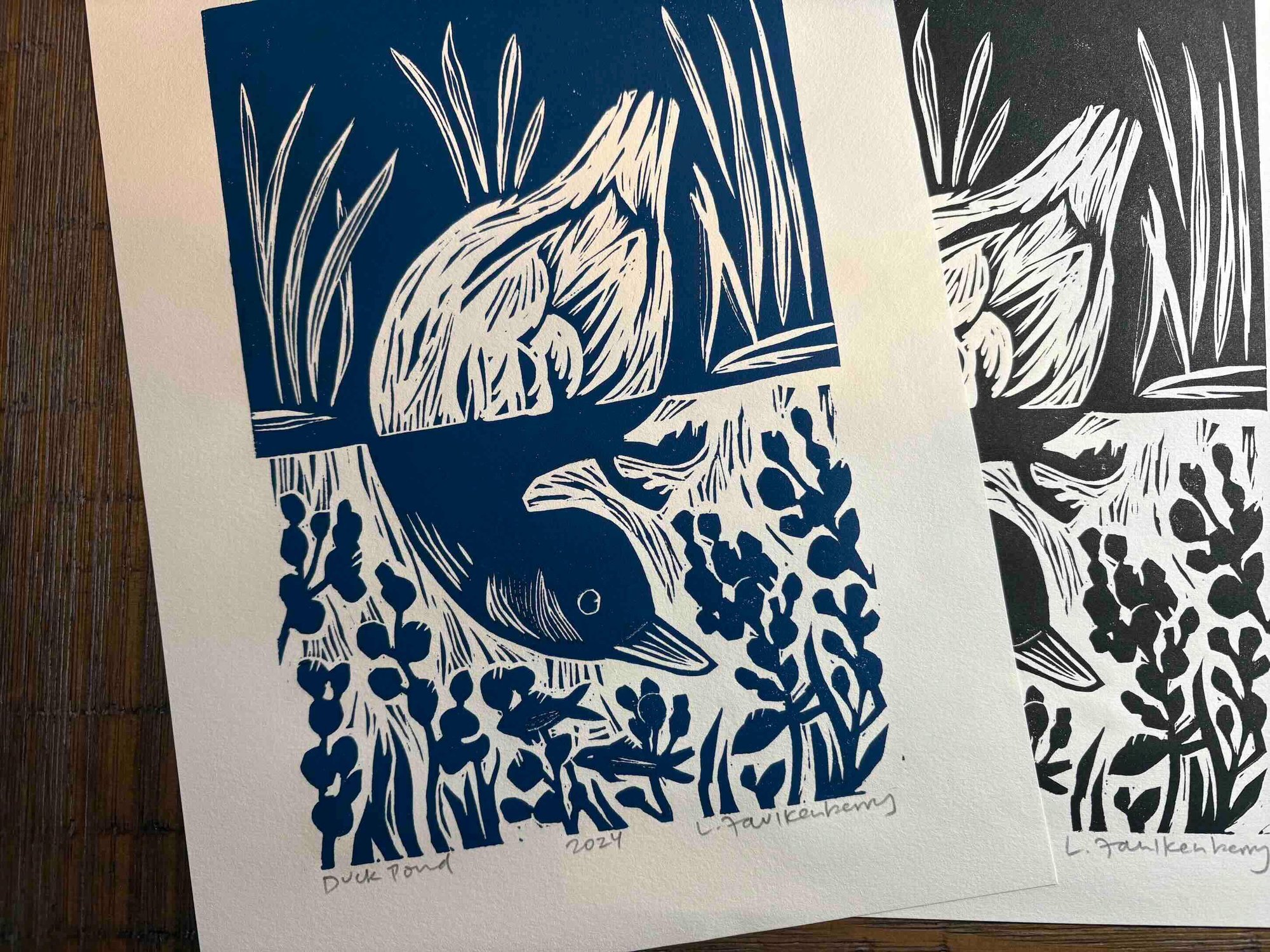 This original art print, "Duck Pond," was printed by hand using a linocut block. This process begins by hand-carving a linoleum block with an image, then inking the block and using the press to print the image onto the paper. This block is printed on soft, heavyweight 100% cotton Stonehenge printmaking paper that is acid-free and archival. Linocut printing is a lovely process that allows the paper to pick up some of the stray marks (or "chatter") left intentionally on the block. Each print is signed and dated.