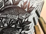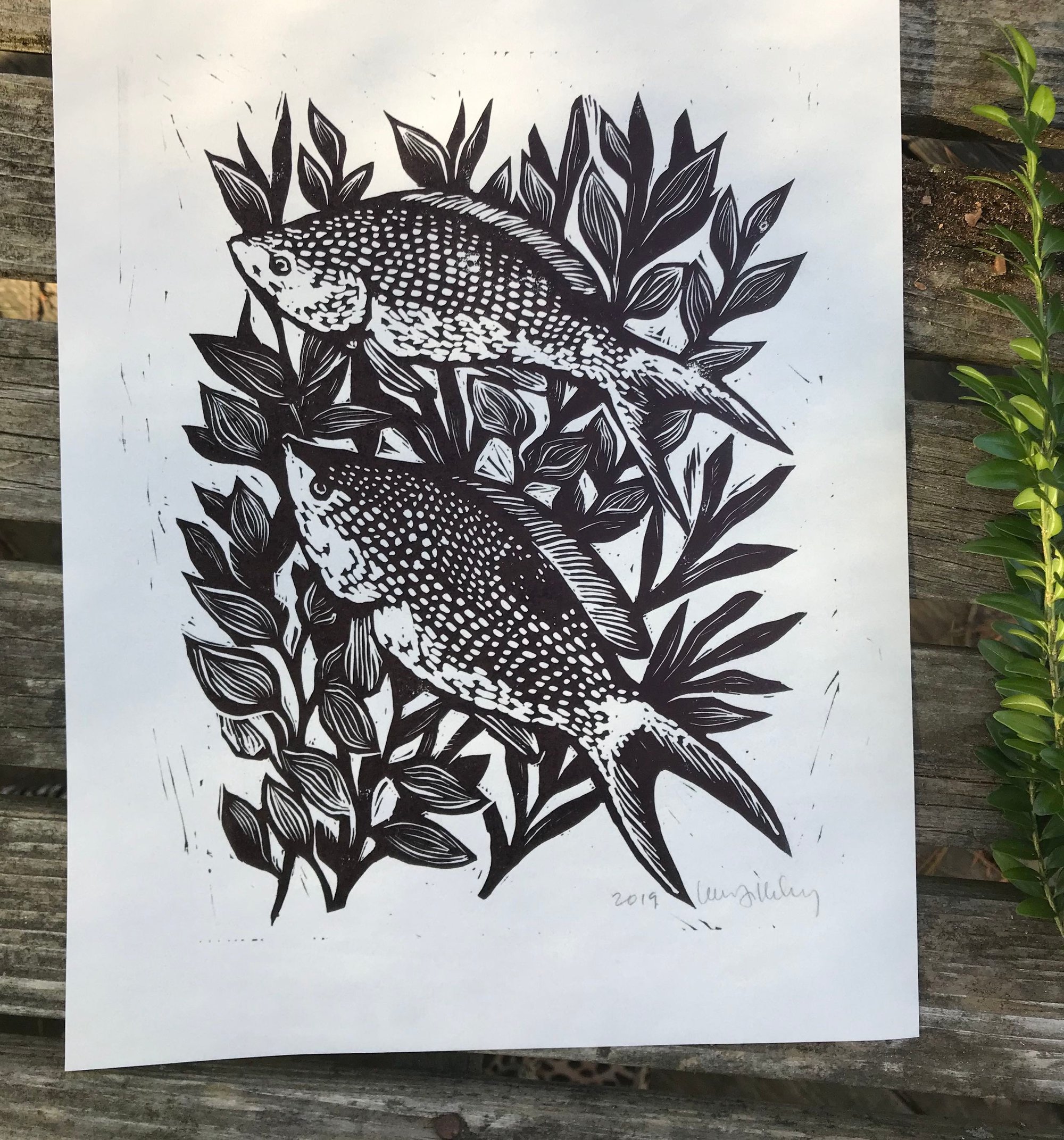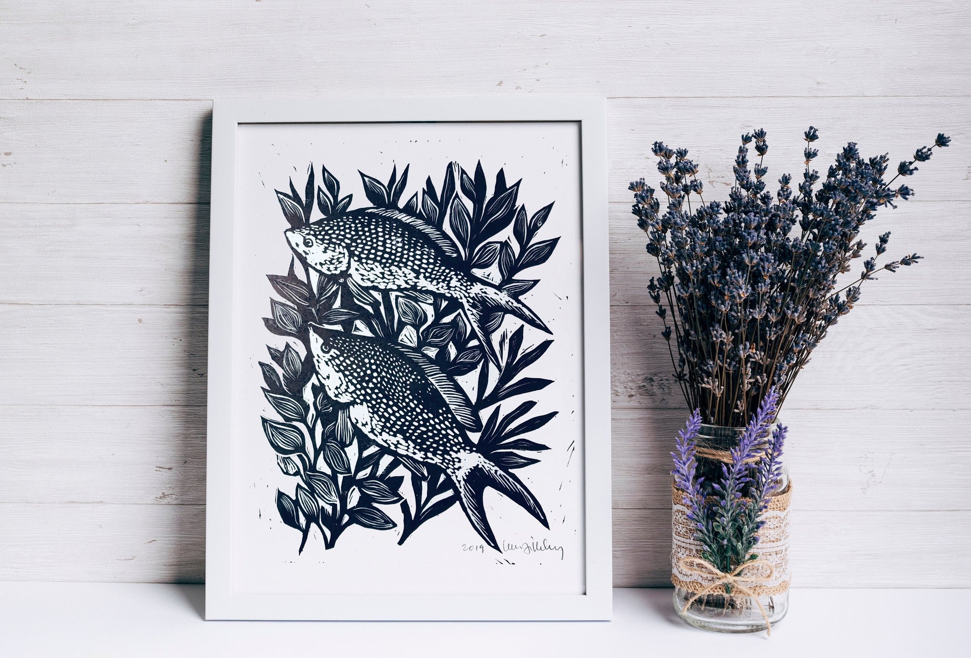 This original linocut print is made by printing a carved linoleum block. Perfect to brighten up your home or office, this print is approximately 8 x 10 inches (image size) with a generous border of white space that makes for easy framing in a standard frame. Paper size is approx 9.5 x 12.5 inches. This print is part of an edition, and each one is signed and numbered. Titled "Aquatic," this print is hand-pulled using traditional printmaking methods.