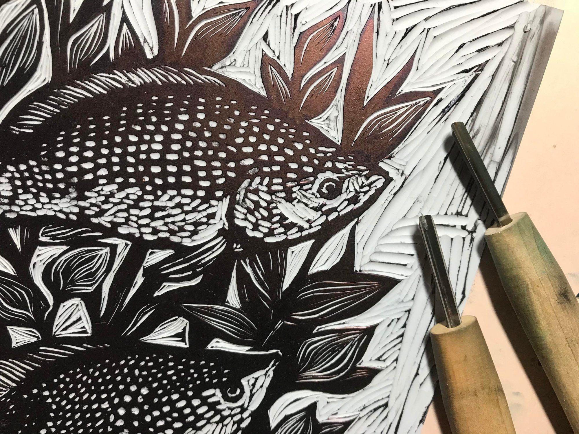 Printing with linocuts is a laborious process, but one that I love. It begins with transferring or drawing an image onto a linoleum block and then carving it with special tools. After a pulling a few test prints (and usually more carving), the block is ready to ink up and print for real. For this print, I did not use a press, but pulled each print by hand, using a baren to achieve the best ink coverage on the paper.