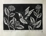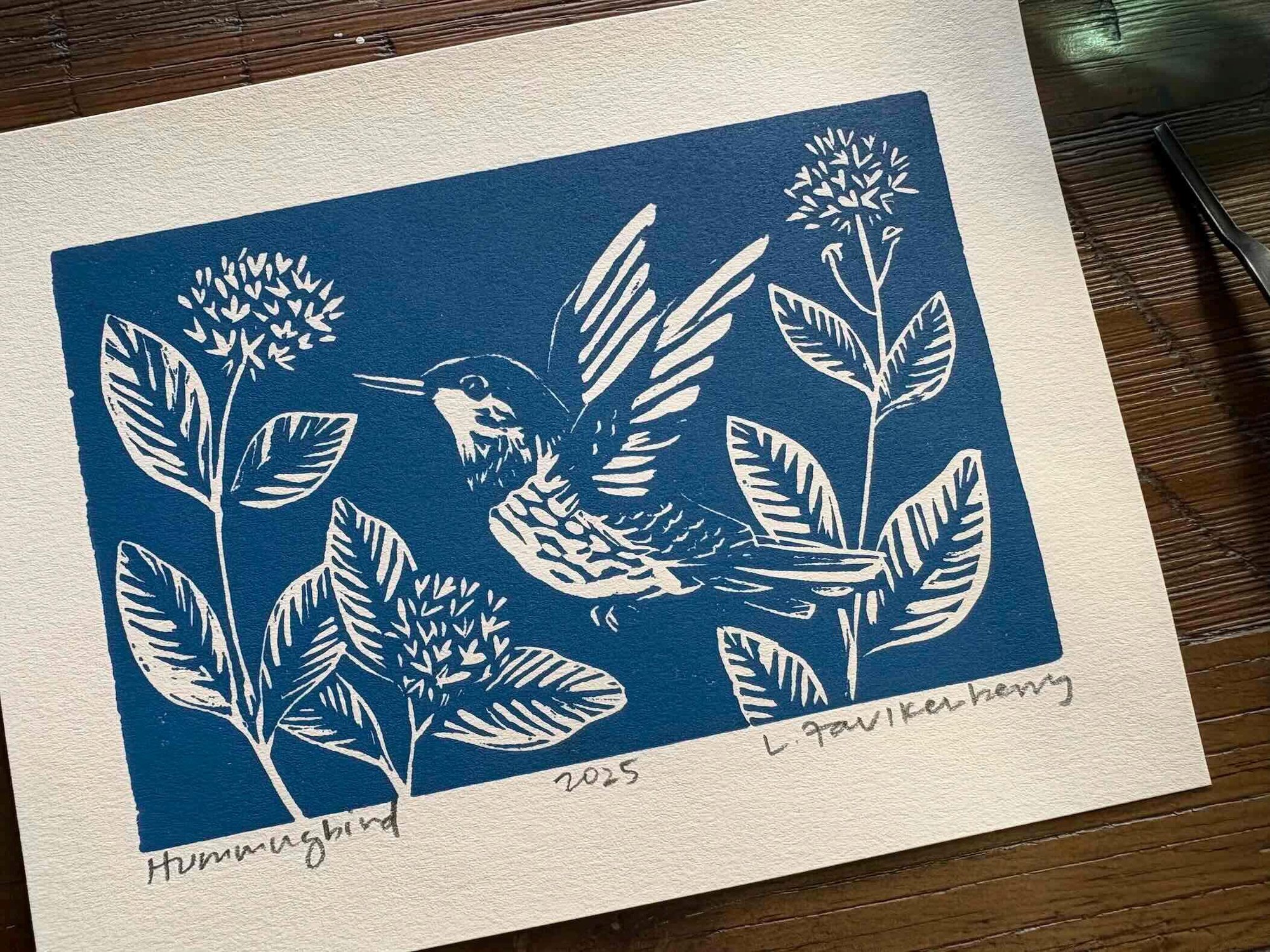 This original art print, "Hummingbird," is part of a new series of mini linocut prints--they're great for grouping together on a wall, or filling in small spaces. When I print with linocuts, I begin by drawing an image onto the linoleum block and then carving the block with small hand tools. I then print the image onto the paper by inking the block by hand and using a baren to apply pressure and transfer the image.