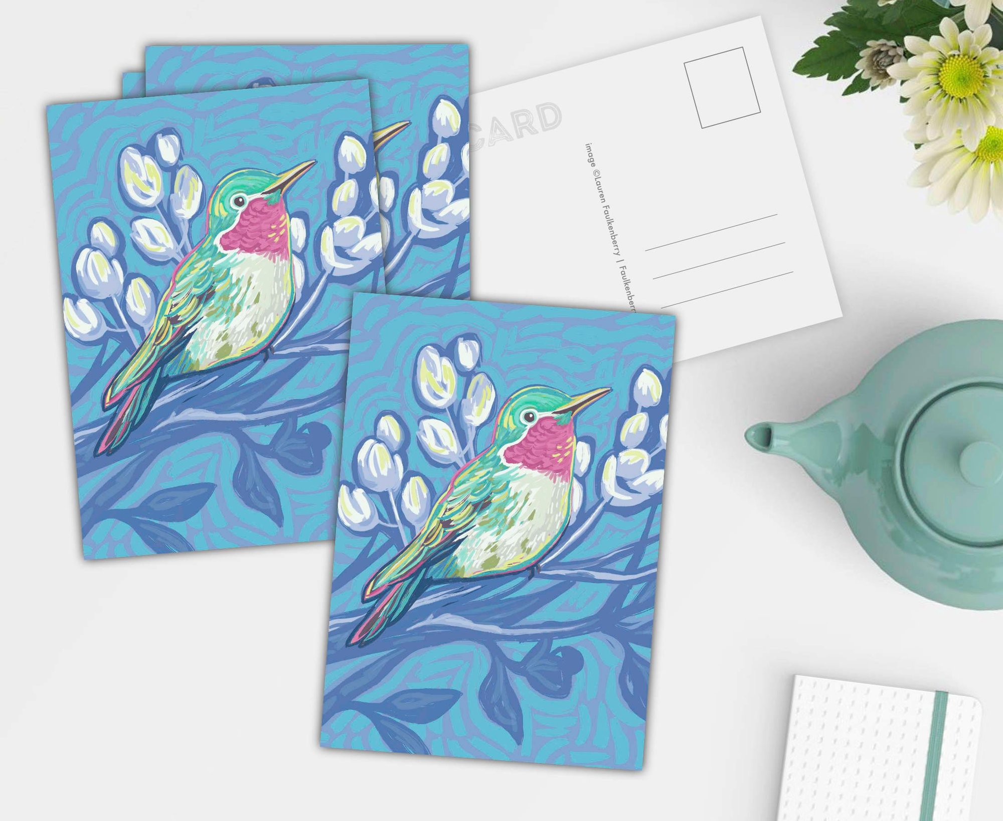 These bright, colorful post cards are made from my own illustration of a hummingbird. Cards are printed on double-thick 130# card stock that is standard postcard weight and very durable. All of my cards are printed using premium inks and paper, which means that they will last for years to come. And the luxe matte finish makes writing on these a breeze!
