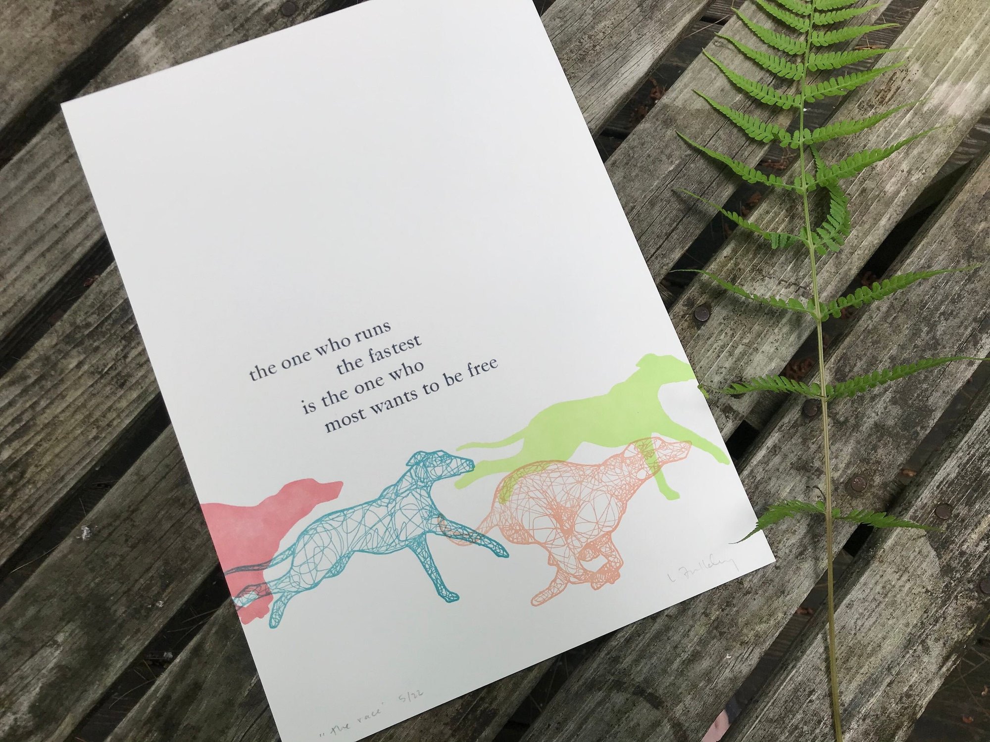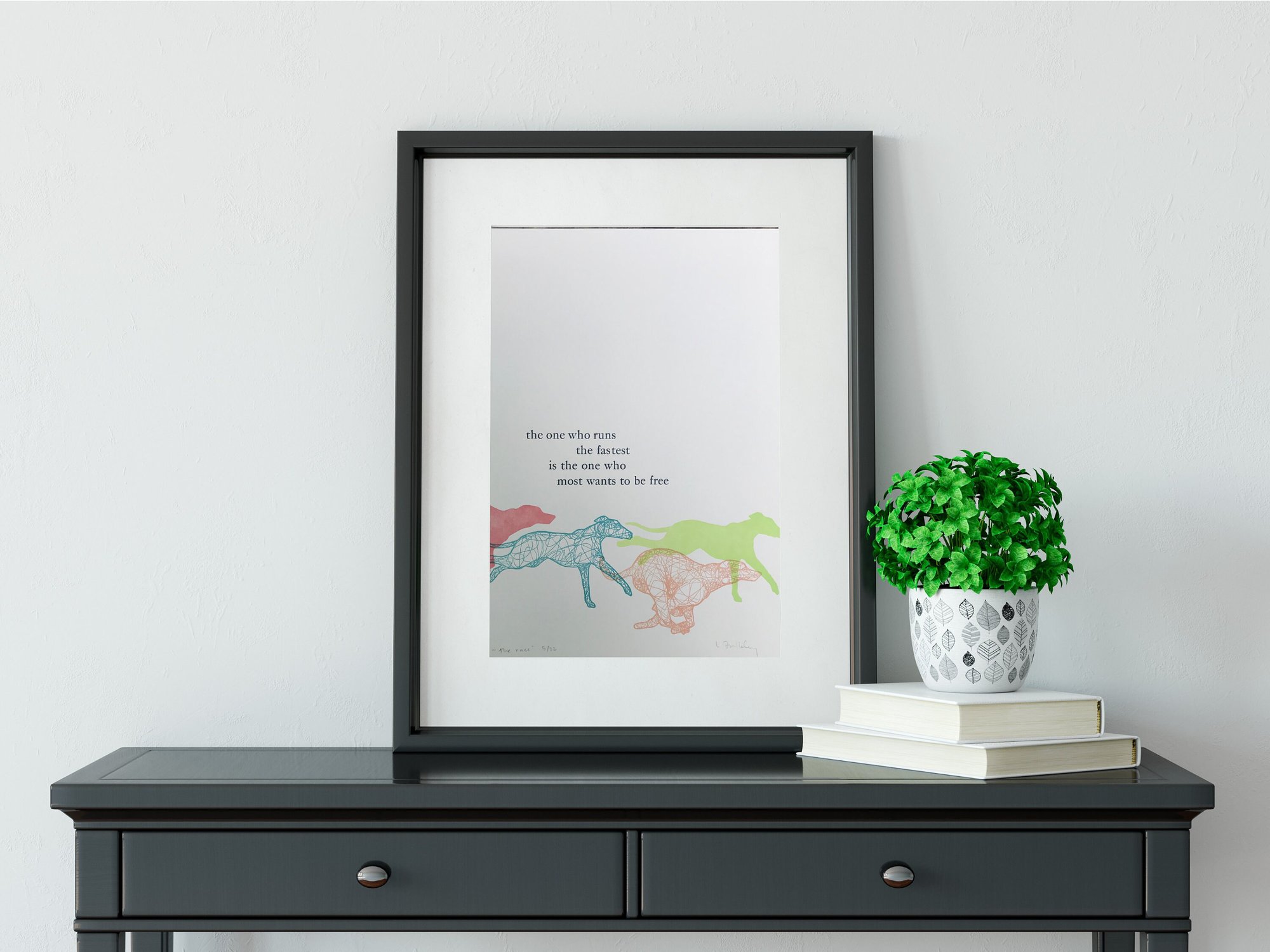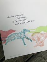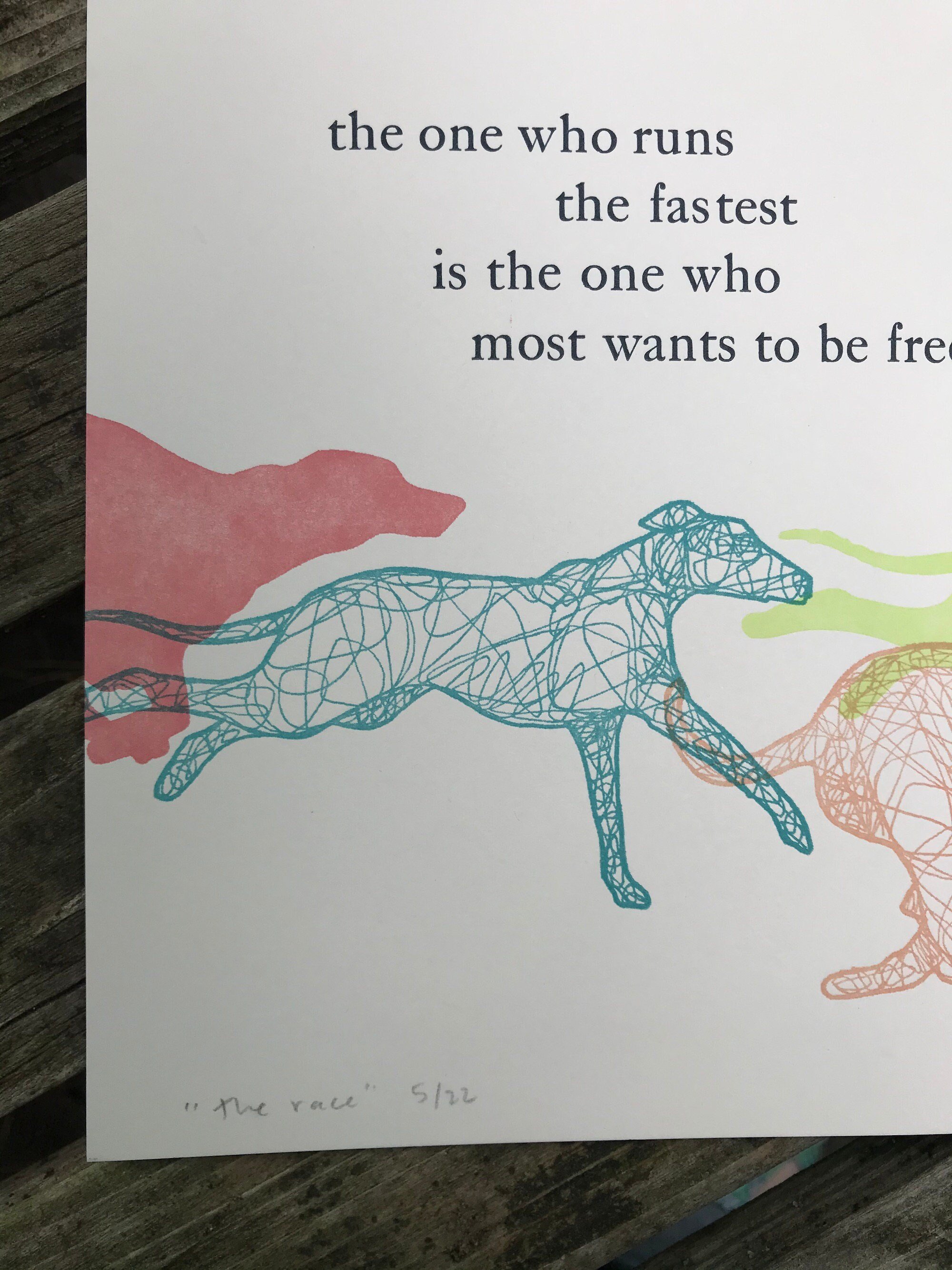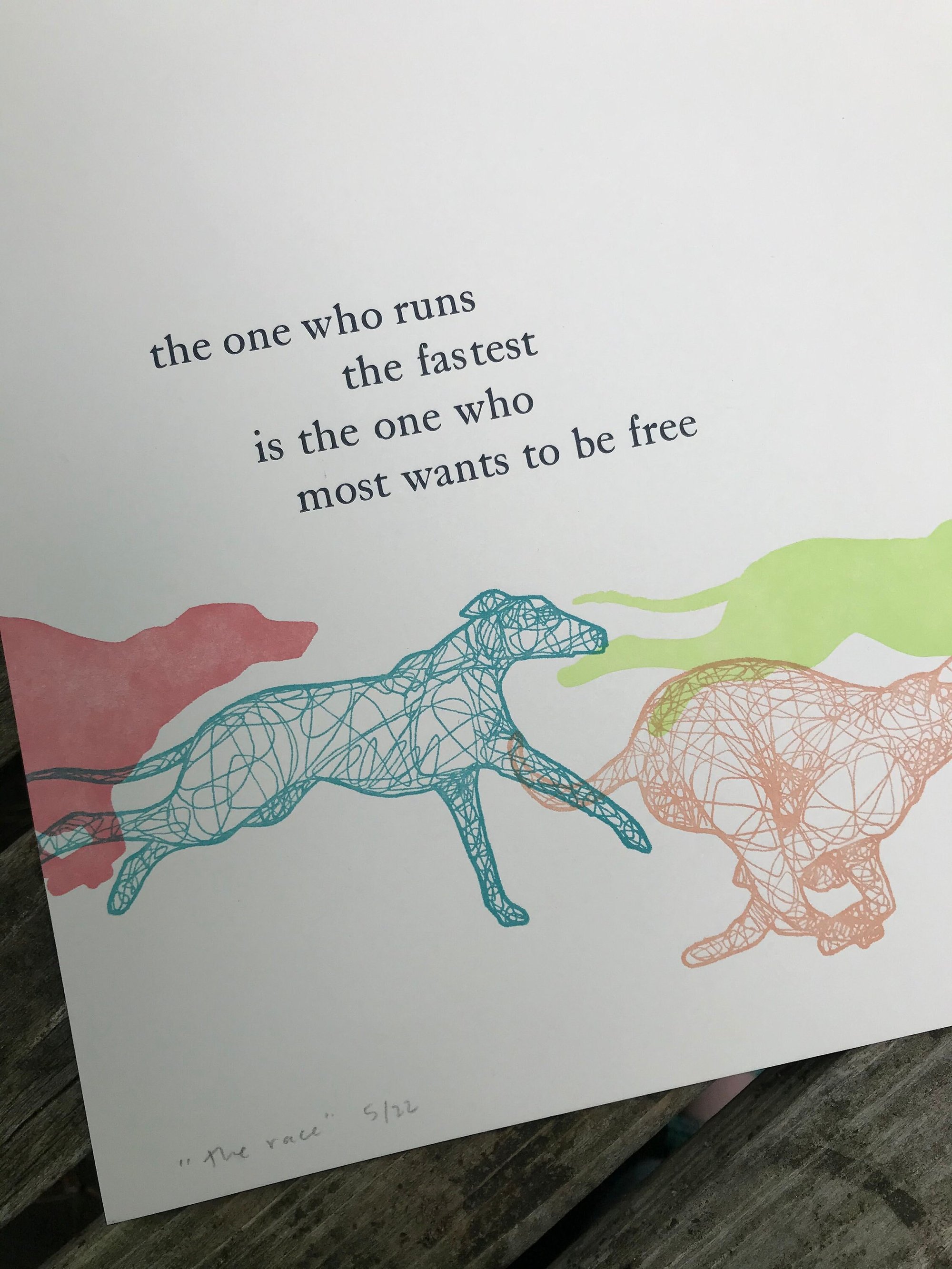 This original print is made using photopolymer plates and metal type. Text reads "The one who runs the fastest is the one who most wants to be free." This was printed in five print runs—one for each color—on a Vandercook letterpress. I created the images by making photopolymer printing plates from my original drawings.