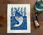 This original art print, "Diving Duck," was printed by hand using a linocut block. This process begins by hand-carving a linoleum block with an image, then inking the block and using the press or hand tools to print the image onto the paper. This block is printed on premium Legion printmaking paper that is acid-free and archival (250 gsm). Linocut printing is a lovely process that allows the paper to pick up some of the stray marks (or "chatter") left intentionally on the block. Each print is signed and dated.
