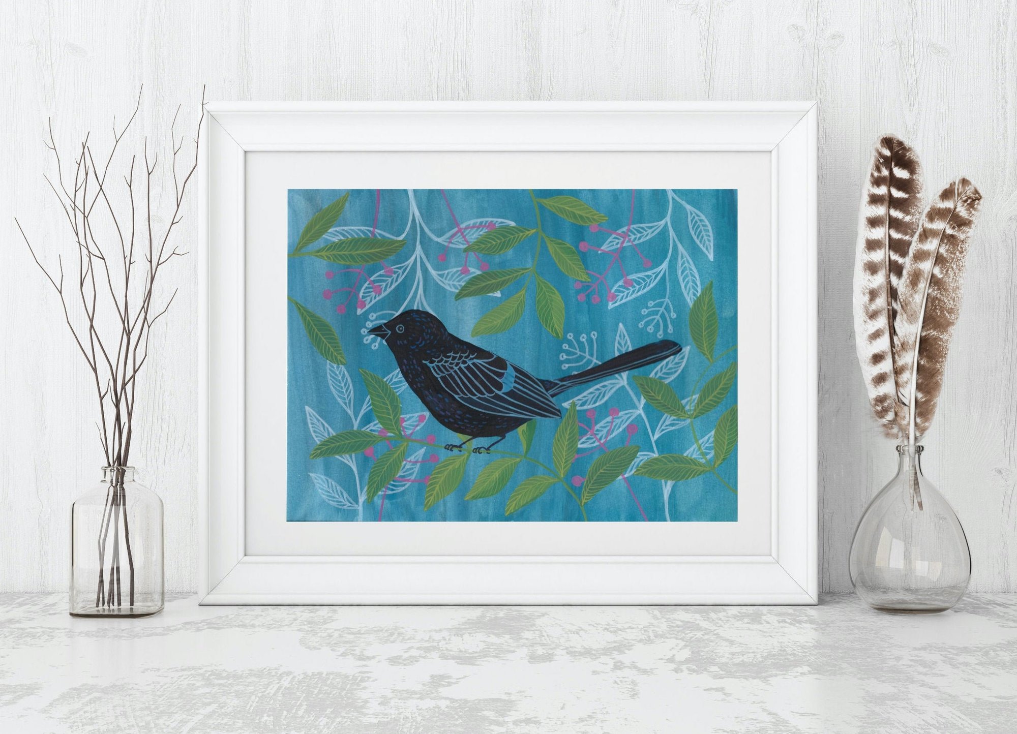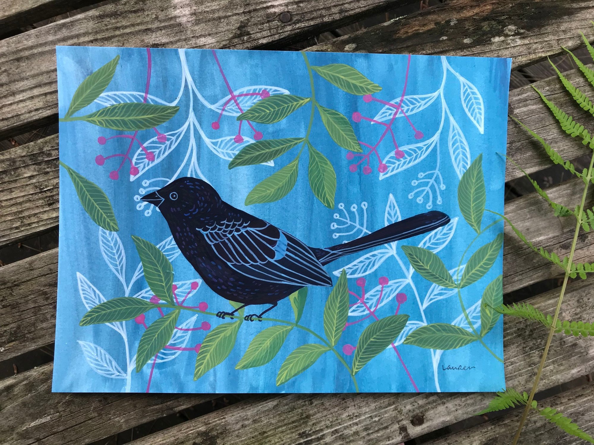 "Night Bird" is an original watercolor and gouache painting. It's painted on premium quality archival watercolor paper, which means it will last for years to come. Image size is approximately 8.5 x 11.5 and is signed and ready to frame. This painting has no border, which makes it easy to frame either inside a mat or using a float frame.