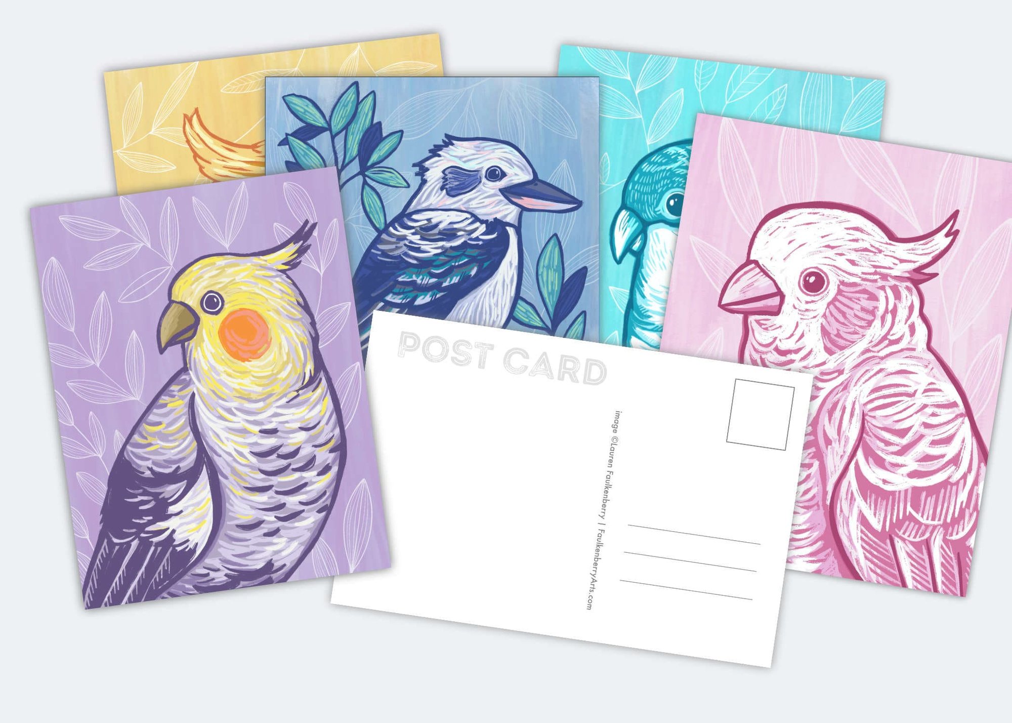 These bright, colorful post cards are made from my own illustrations of tropical birds. Cards are printed on double-thick 130# card stock that is standard postcard weight and very durable. All of my cards are printed using premium inks and paper, which means that they will last for years to come. And the luxe matte finish makes writing on these a breeze!