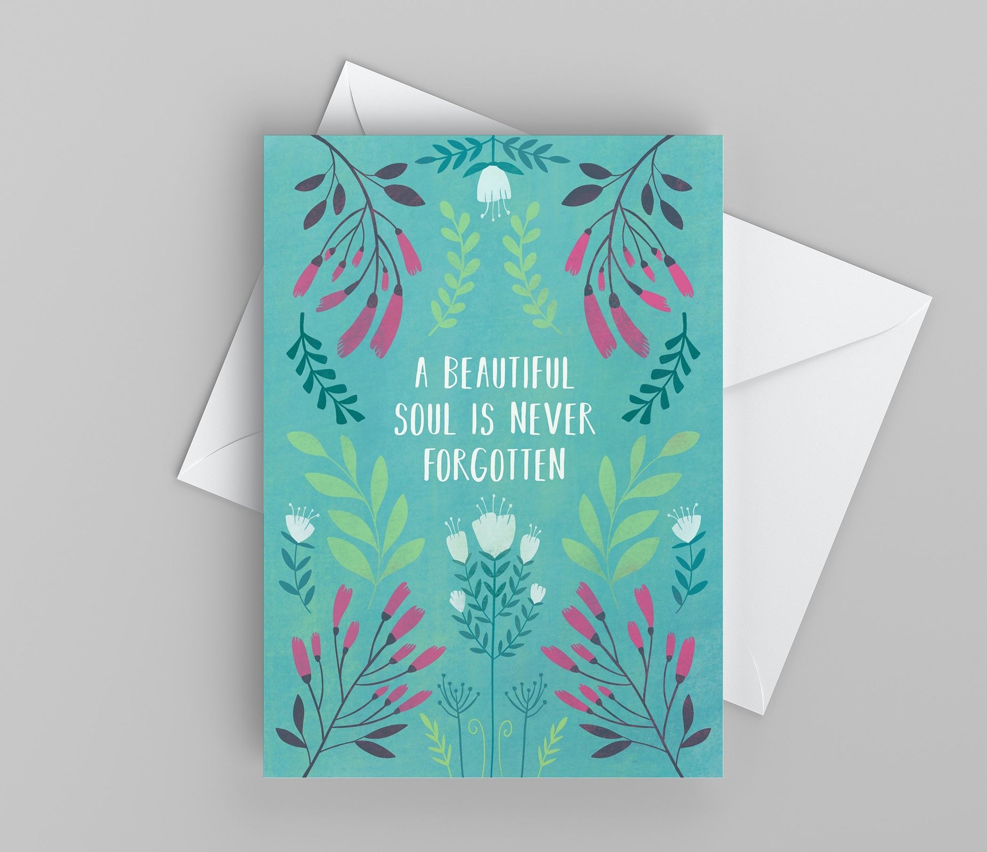 This greeting card is a sweet way to send love, condolences, and sympathy. Blank inside, it leaves all the words up to you. These cards are high-quality digital reproductions of one of my original illustrations and includes text on the front that reads "A beautiful soul is never forgotten." Size is 5 x 7 inches. The set includes 10 cards and 10 white peel-and-stick envelopes.