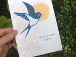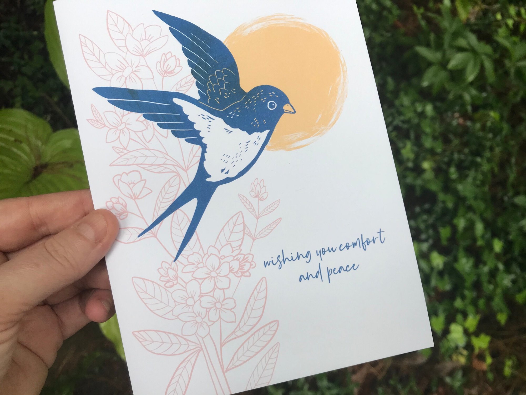 This greeting card is a sweet way to send love, condolences, and sympathy. The illustration features a swallow and forget-me-nots. Front text reads, "Wishing you comfort and peace," and the inside is blank. These cards are premium-quality reproductions of one of my linocut prints. Size is 5 x 7". The set of 10 cards include matching white peel-and-stick envelopes.