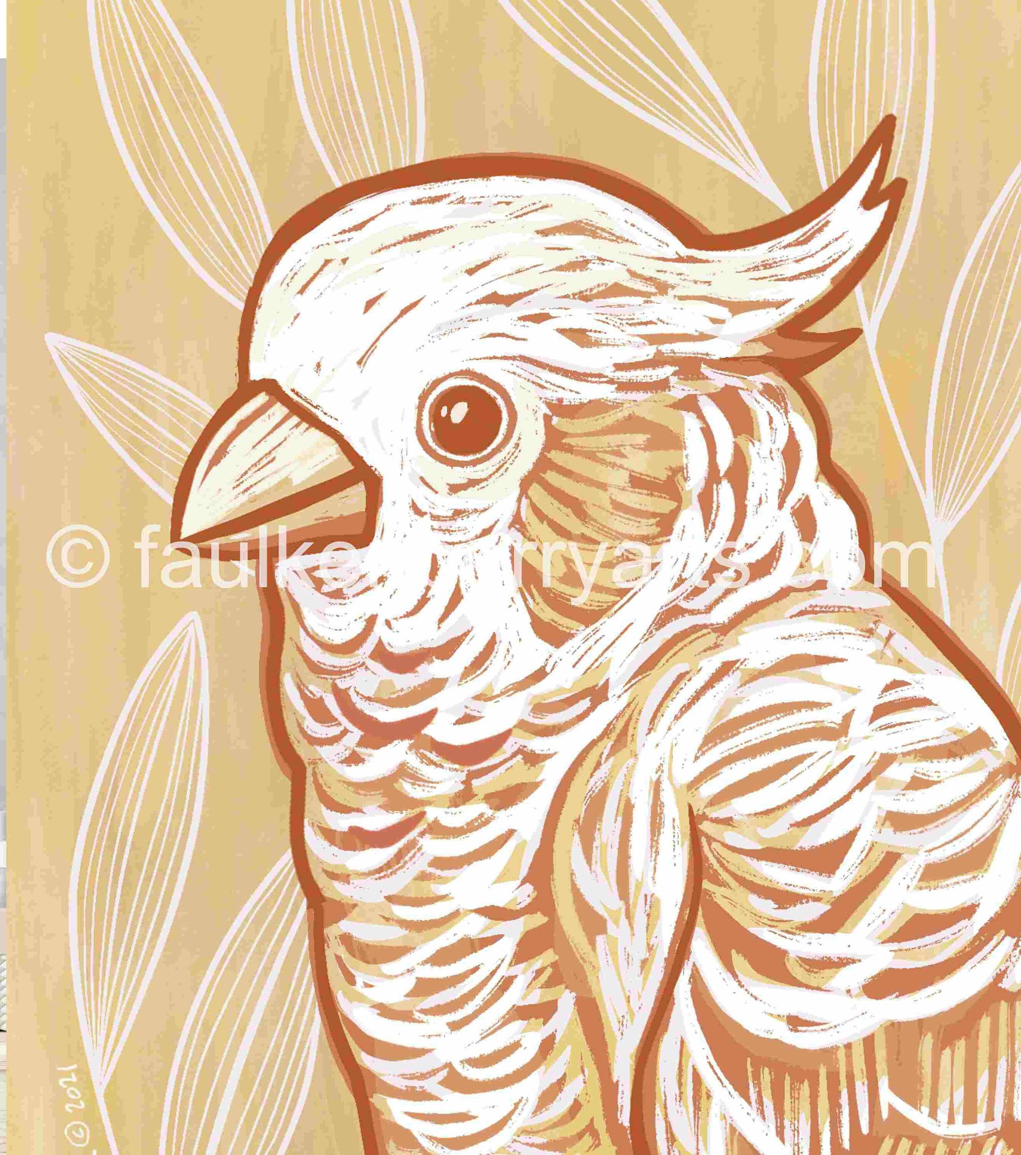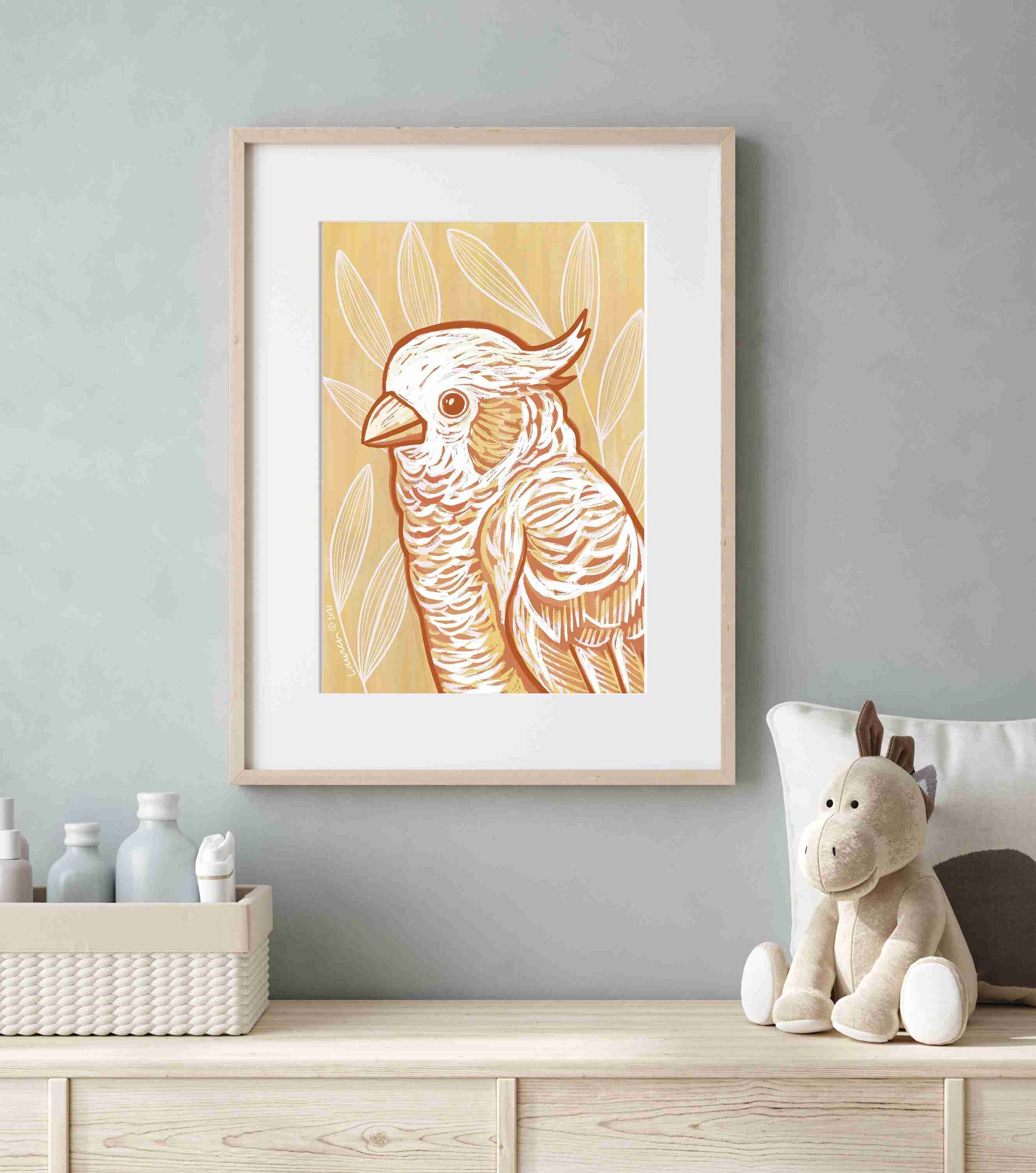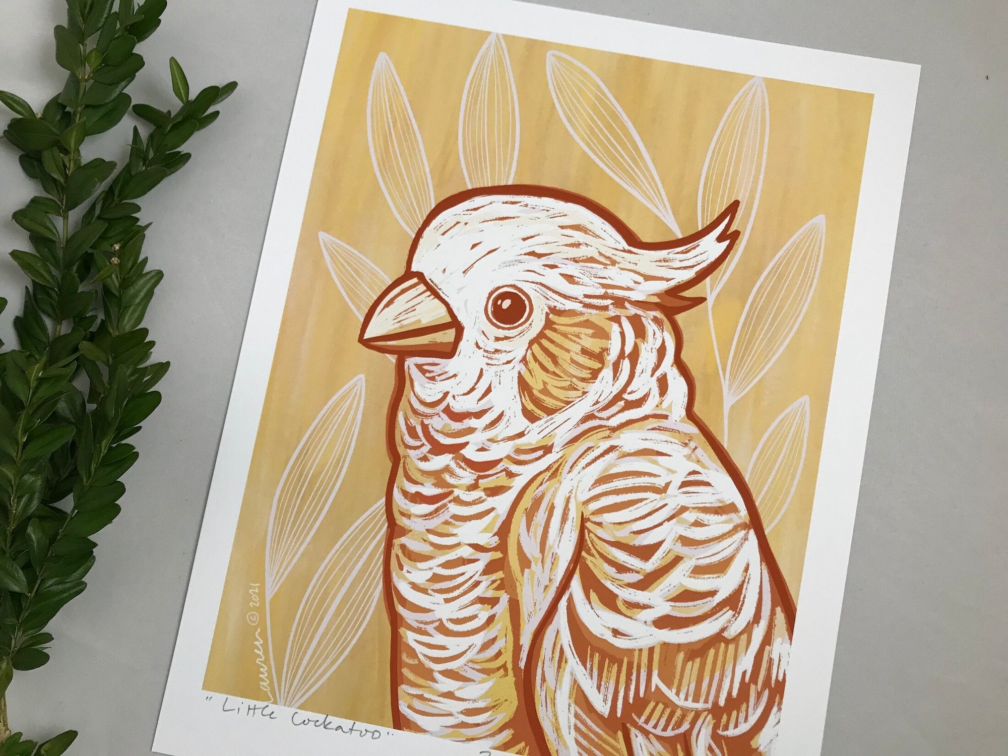 This gold cockatoo is an archival print of one of my original illustrations and is part of a new series of brightly colored bird prints in a rustic woodcut style. It makes a great addition to your home or office decor, and is great for a nursery, too! Pairs nicely with the other birds in this series.