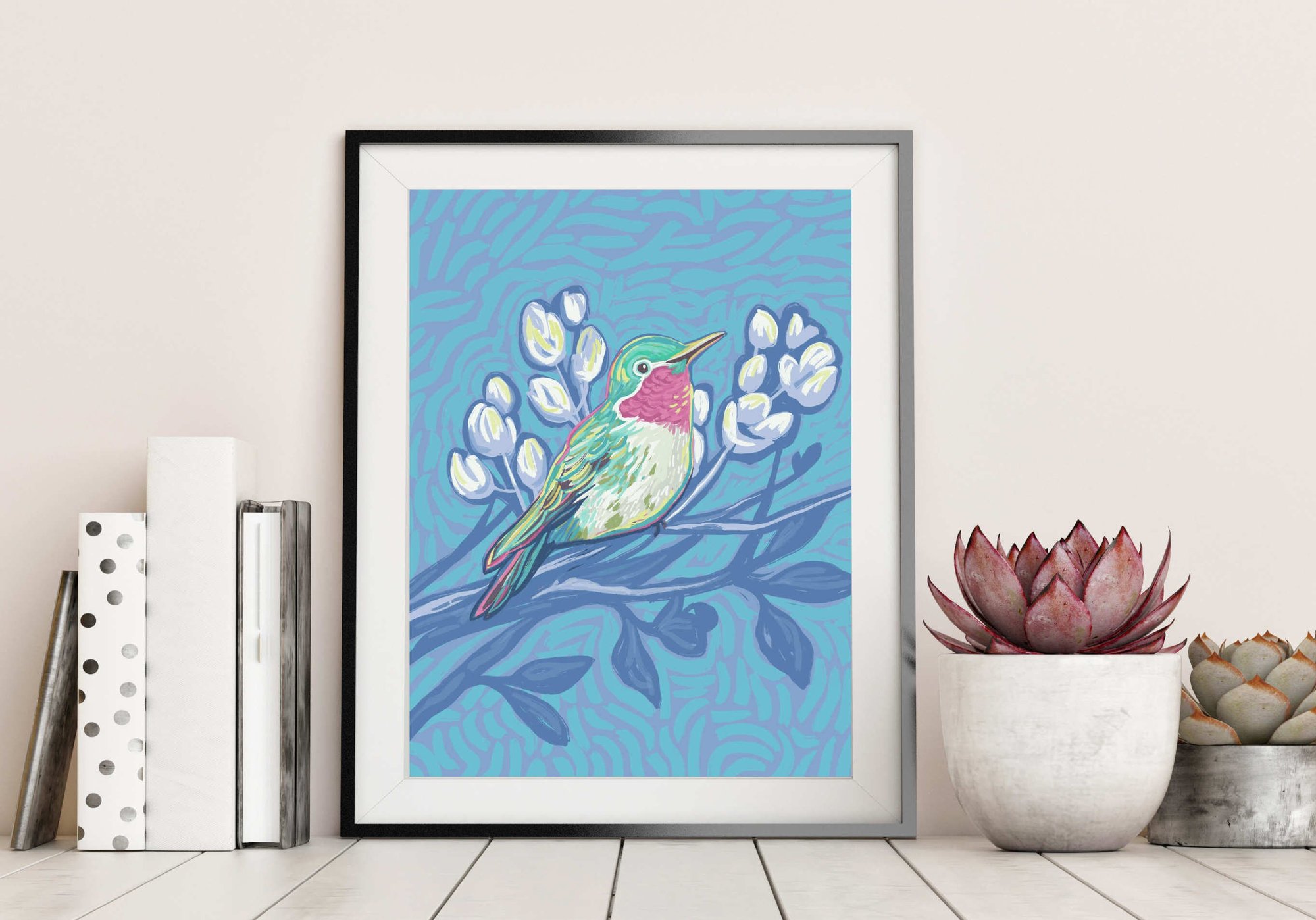 This colorful hummingbird is an archival print of one of my original illustrations. It makes a bright, whimsical addition to your home or office decor, and is great for a nursery, too!